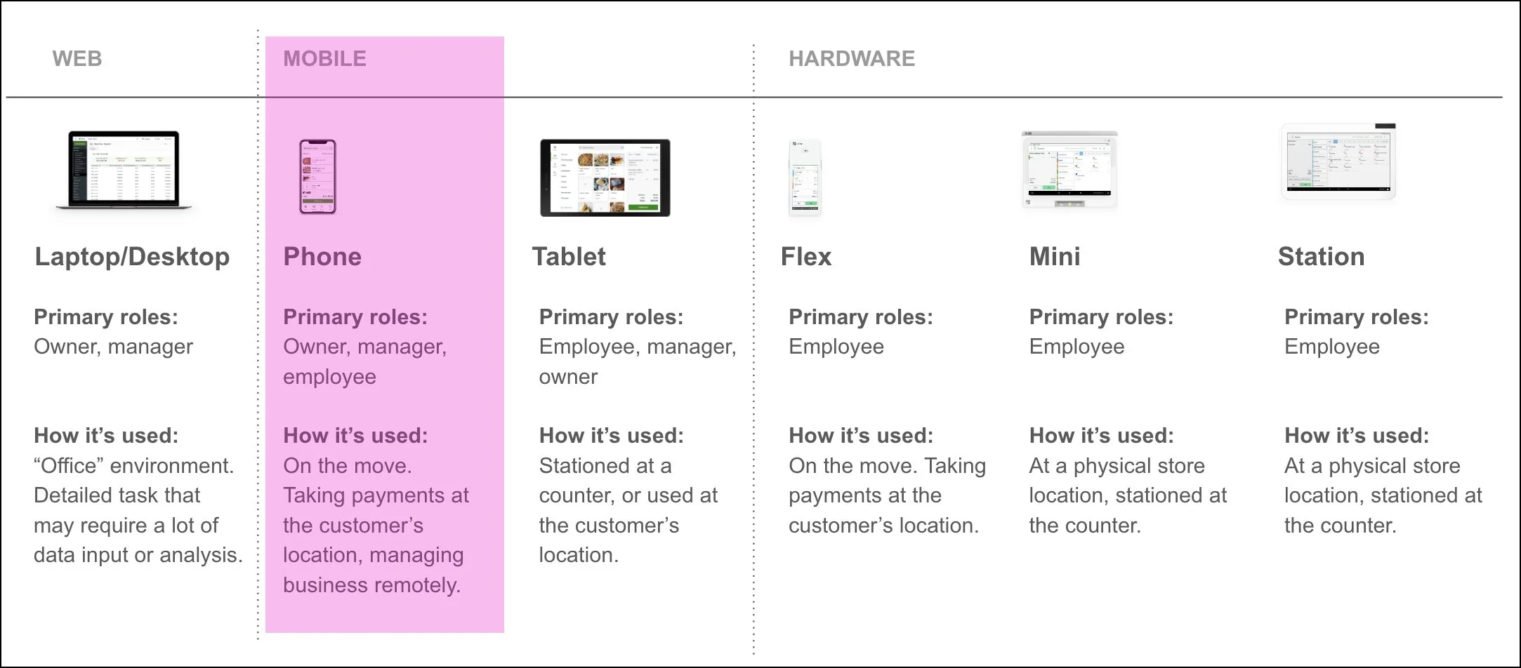 Before the redesign, we conducted several interviews with existing merchants to understand the core tasks and audiences for each of Clover’s main form factors (web, mobile and POS hardware). This gave us a better understanding of the core tasks to focus on for Clover Go.