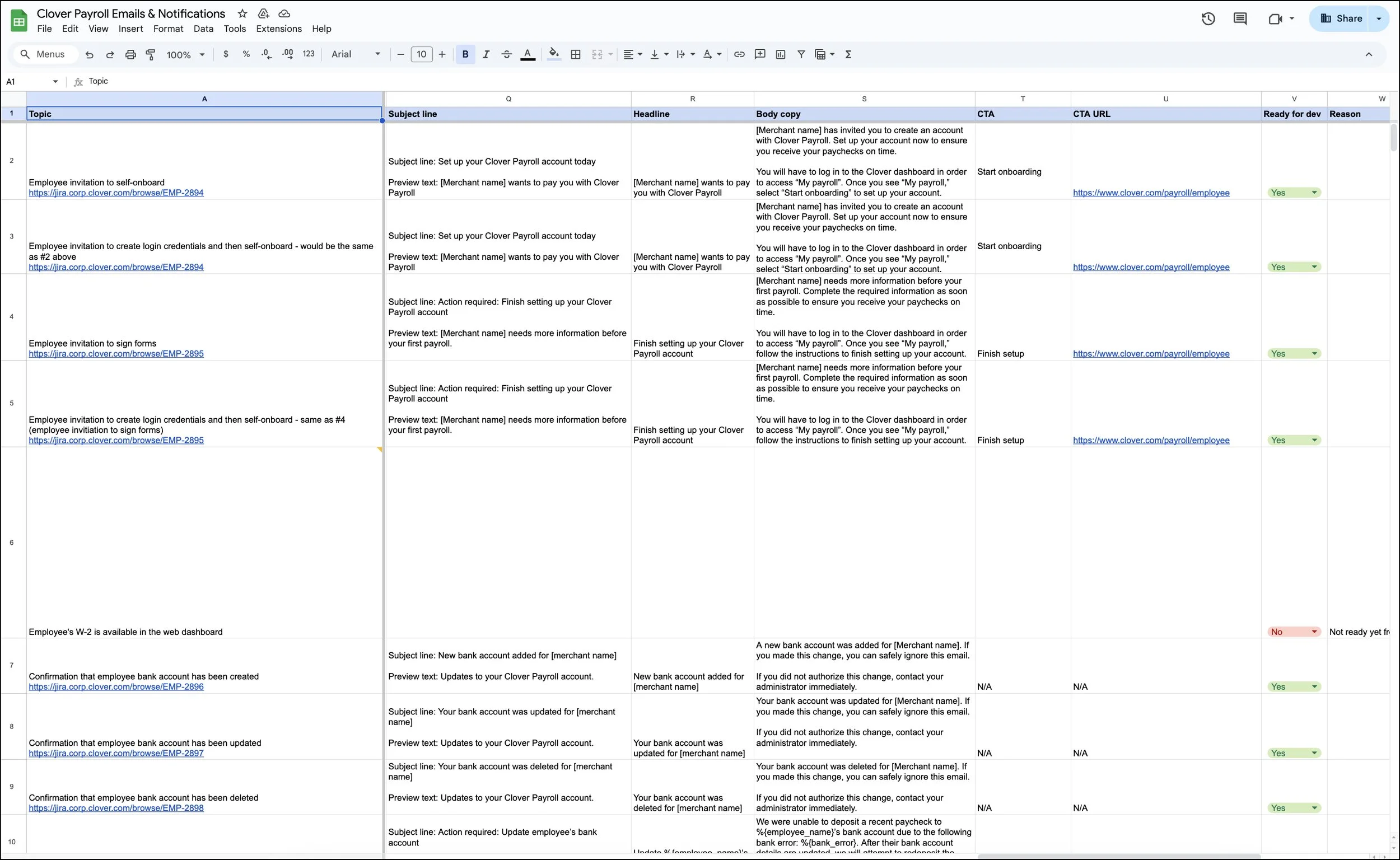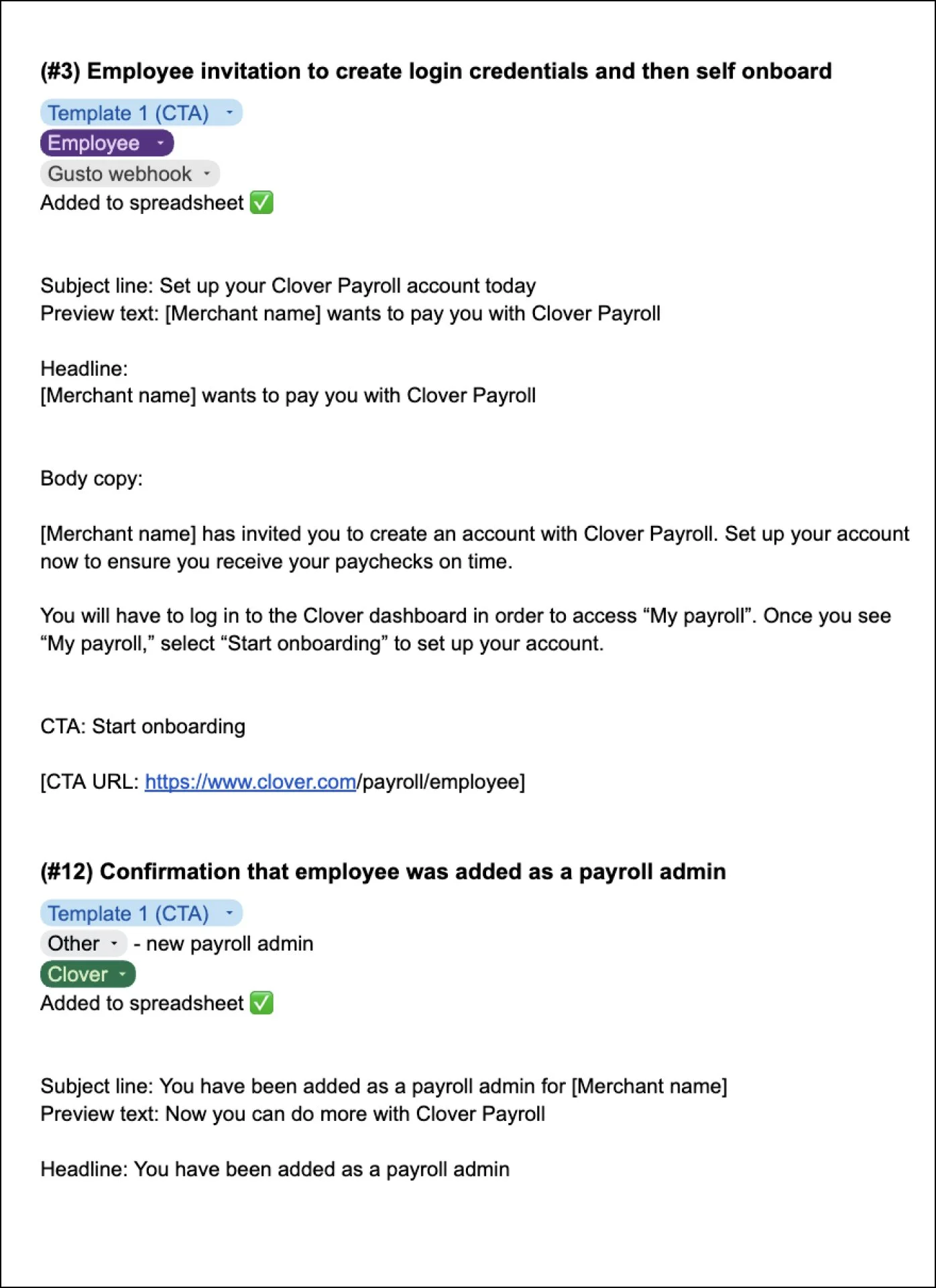 For myself, I created a google doc which I used as my “source of truth” for the email content. This is where I solicited feedback from Gusto as well as the product manager to ensure all content was correct before adding it to the final spreadsheet.